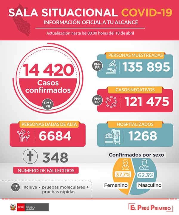 Con relación al procesamiento de las muestras (moleculares y serológicas o rápidas) por coronavirus Covid-19, el Ministerio de Salud (Minsa) informa que al18 de abril de 2020 se han procesado muestras para 135 895 personas por Covid-19, obteniéndose, hasta las 00:00h, 14 420 resultados positivos y 121 475 negativos.