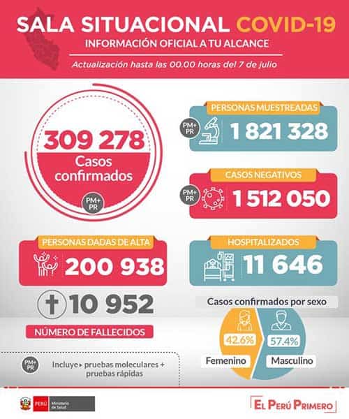 El Ministerio de Salud (Minsa) informa que al 7 de julio de 2020 se han procesado muestras para 1’821,328 personas por Covid-19, obteniéndose, hasta las 00:00h, 309,278 resultados positivos y 1’512,050 negativos.