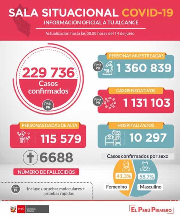 El Ministerio de Salud (Minsa) informó que al 14 de junio de 2020 se han procesado muestras para 1’360,839 personas por Covid-19, obteniéndose, hasta las 00:00h, 229 736 resultados positivos y 1’131,103 negativos.
