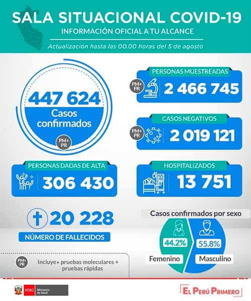 El Ministerio de Salud (Minsa) informa que hasta las 00:00 horas del día 5 de agosto de 2020 se han procesado muestras para 2 466 745 personas por la COVID-19, obteniéndose, 447 624 resultados positivos y 2 019 121 negativos.