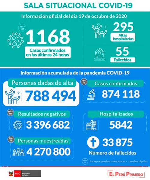 El Ministerio de Salud (Minsa) informa que hasta las 22:00 horas del día 19 de octubre de 2020 se han procesado muestras para 4 270 800 personas por la COVID-19, obteniéndose, 874 118 casos confirmados y 3 396 682 negativos.