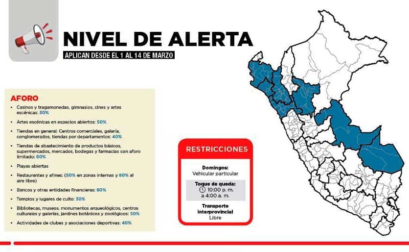 La presidenta del Consejo de Ministros, Violeta Bermúdez, anunció que se levantó la cuarentena para las provincias que están incluidas en el nivel de riesgo extremo. Sin embargo, precisó que la inmovilización social obligatoria, medida más conocida como toque de queda, será a partir de las 9 de la noche hasta las 4 de la mañana y durante todo el día en los domingos 7 y 14 de marzo.