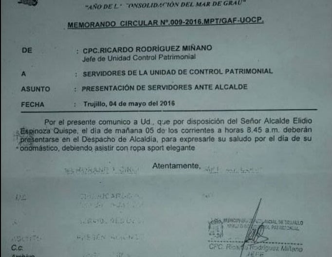 El 4 de mayo, vísperas del cumpleaños del alcalde Elidio Espinoza, el jefe de la Unidad de Control Patrimonial de la MPT, Ricardo Rodríguez Miñano, firmó el memorando N° 009-2016 donde se comunicaba al personal municipal que debía ir al despacho del burgomaestre a las 8:45 am a saludarlo por su cumpleaños vistiendo ropa sport elegante.
