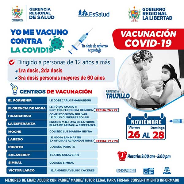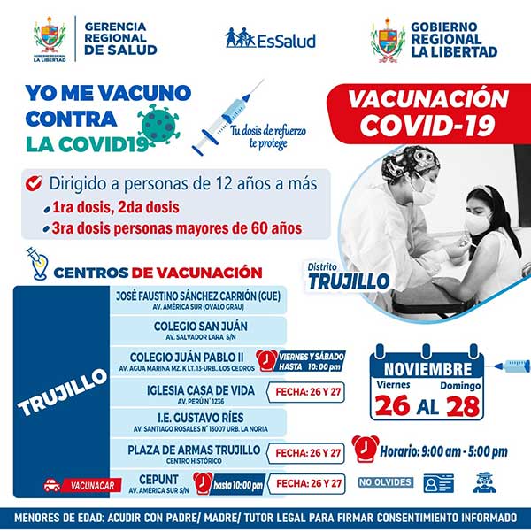 Del viernes 26 al domingo 28 de noviembre: Vacuna contra la Covid-19, desde los 12 años a más en la provincia de Trujillo