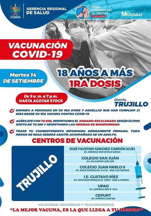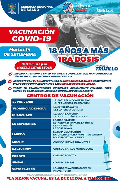 En la provincia de Trujillo se atenderá en 20 locales, en horario extendido, hasta este viernes y hasta agotar el stock de 213,665 vacunas recibidas, de las que una parte corresponde a segundas dosis. El objetivo trazado es que a fines de octubre se tenga protegida a toda la población objetivo mayor de 18 años, logrando la inmunidad de rebaño.