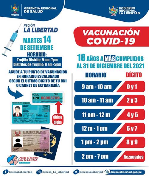 A partir este martes 14 se vacunará contra la covid-19 a la población mayor de 18 años o quienes cumplan esta edad hasta el 31 de diciembre del 2021, en todos los puntos establecidos en La Libertad, indicó en conferencia de prensa el gobernador regional, Manuel Llempén Coronel, precisando que esta es la mejor manera de prevenir contagios y fallecidos ante una tercera ola de la pandemia por la variante delta.