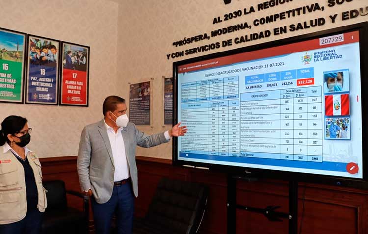 El gobernador regional Manuel Llempén Coronel dijo que en La Libertad el 20% de la población objetivo ya tiene su segunda dosis y está inmunizado contra la covid-19, pero que eso no significa que se deba bajar la guardia, por el riesgo latente de una tercera ola ante la aparición de la variante delta.