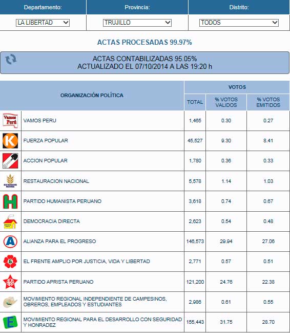 La Oficina Nacional de Procesos Electorales mediante su página web difundió los resultados de las elecciones para la alcaldía de Trujillo. Al 99,97% de actas procesadas según ONPE, Elidio Espinoza obtiene 31,75% de votos válidos y Manuel Llempén 29,94%.
