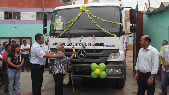 En sencilla ceremonia realizada hoy en el local de la municipalidad de Laredo fueron inauguradas y bendecidas la compactadora marca Mercedes Benz, 30 papeleras, 10 recolectores de residuos sólidos de 24 lts y 2 de 800 lts para mejorar la limpieza pública de Laredo y sus centros poblados. La inversión asciende a 450 mil nuevos soles.