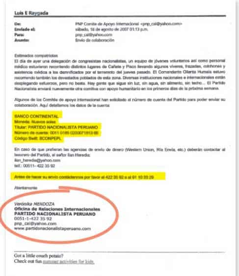 Correos electrónicos a los que tuvo acceso Willax Televisión, y que fueron proporcionados por el ex embajador del Perú en Venezuela durante este gobierno y ex dirigente nacionalista Luis Raygada, revelan que la hoy candidata Verónika Mendoza realizó coordinaciones en el 2007 a través de la cuenta [email protected] para que personas en el extranjero envíen aportes al Partido Nacionalista.