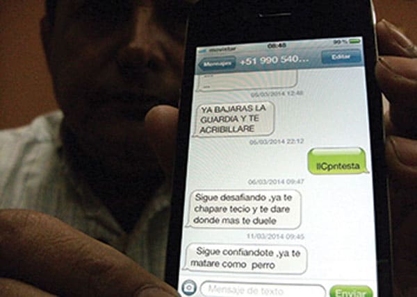 “Ahora tu vida y la vida de tu familia vale 10 mil soles, la policía no podrá cuidarlos las 24 horas, será mejor que busques una solución pacífica, antes que envíe el primer atentado a tu casa y también a la de tu hermana Nancy, piénsalo bien y evita derramamientos de sangre, tienes una hora o tendrás atakes (sic)”.