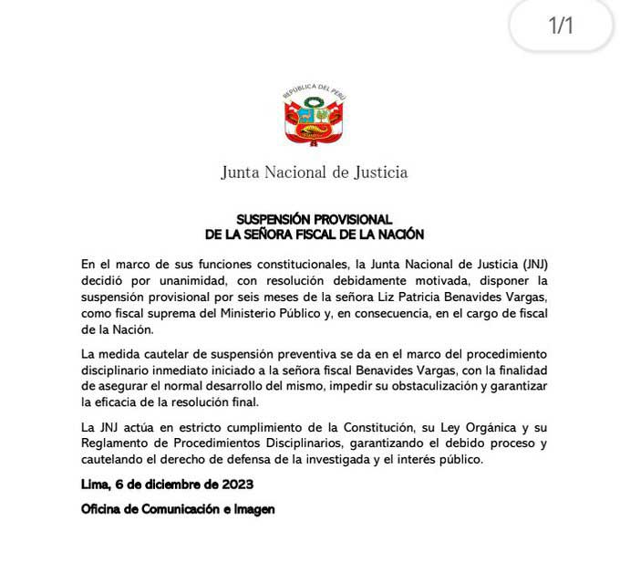 «En el marco de sus funciones constitucionales, la Junta Nacional de Justicia decidió por unanimidad, con resolución debidamente motivada, disponer la suspensión provisional por seis meses de la señora Liz Patricia Benavides Vargas, como fiscal suprema del Ministerio Público y, en consecuencia, en el cargo de fiscal de la Nación», se lee en el documento que da cuenta de la decisión.