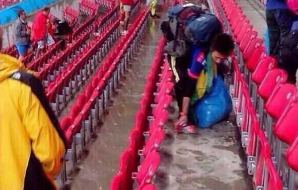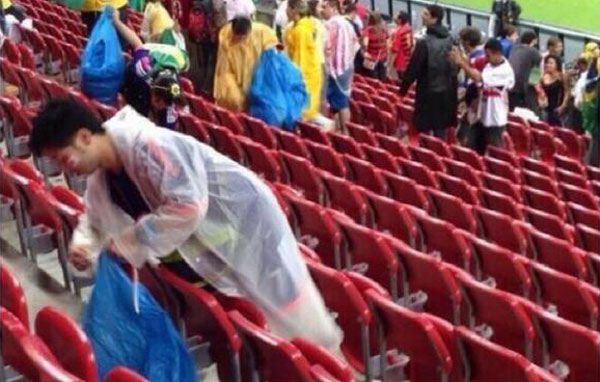 A pesar de que al equipo dirigido por el italiano Alberto Zaccheroni se le escapó el triunfo tras comenzar arriba en el marcador, una decena de hinchas japoneses se quedaron en el estadio para recolectar la basura que generaron durante el partido.