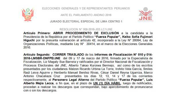 La resolución toma en cuenta los pedidos de exclusión presentados contra la candidata de Fuerza Popular y señala que «existen elementos suficientes para la apertura del procedimiento de exclusión de Keiko Fujimori».