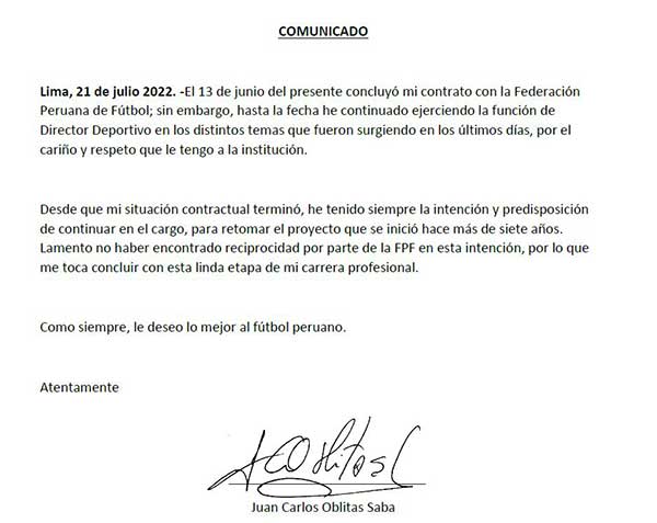 En el documento, Oblitas indicó que siempre tuvo la “intención y predisposición” de continuar en el cargo que ocupó por más de siete años, pero no encontró “reciprocidad por parte de la FPF en esta intención”.