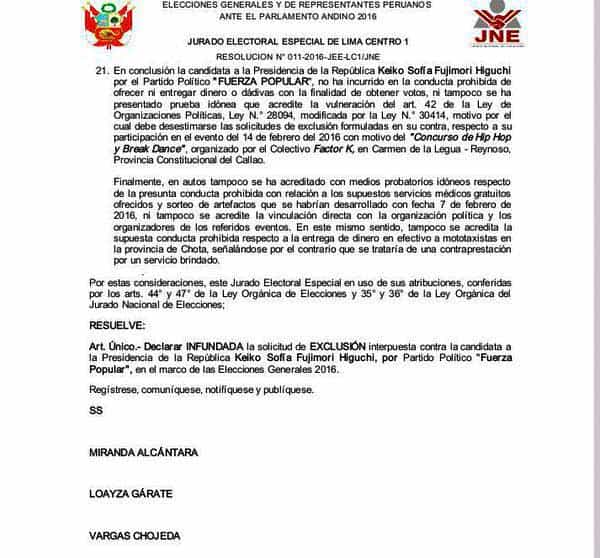 «Se declara infundada la solicitud de exclusión interpuesta contra la candidata a la Presidencia de la República Keiko Fujimori, por Fuerza Popular, en el marco de las Elecciones Generales 2016», resuelve el expediente.