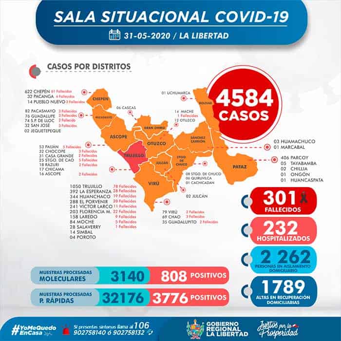 La Gerencia Regional de Salud de La Libertad, en su reporte de hoy 31 de mayo, informa que a la fecha se ha procesado 35316 (+944) pruebas entre rápidas y moleculares, resultando 4584 (+454) contagiados de Coronavirus en La Libertad, es decir alcanzó el mayor número de contagiados de Coronavirus con 454 nuevos casos en las últimas 24 horas