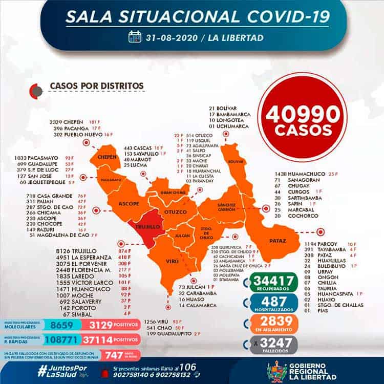 La Gerencia Regional de Salud de La Libertad, informa que al 31 de agosto, se han procesado 117 430 (+ 776) pruebas entre rápidas y moleculares, resultando 40 990 (+ 286 ) casos positivos por Coronavirus en La Libertad, en las últimas 24 horas procesaron 776 pruebas, resultando 286 nuevos infectados por Covid-19,