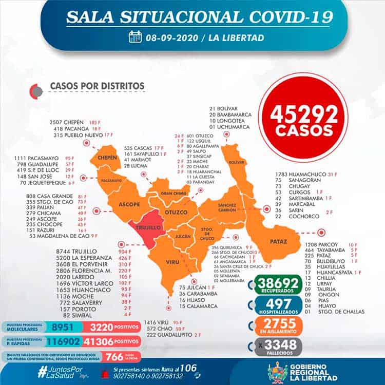 La Gerencia Regional de Salud de La Libertad, informa que al 08 de setiembre, se han procesado 125 853 (+ 1908) pruebas entre rápidas y moleculares, resultando 45 292 (+ 428 ) casos positivos por Coronavirus en La Libertad, en las últimas 24 horas procesaron 1908 pruebas, resultando 428 nuevos infectados por Covid-19,