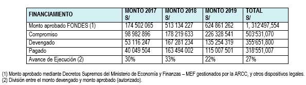 En la región La Libertad, de los S/ 1, 312 millones 497 mil 554 aprobados para las obras y servicios de construcción y reconstrucción de las zonas afectadas por el fenómeno de El Niño Costero, el Estado ejecutó el 27% que equivale a S/ 355 millones 651 mil 800 (período setiembre de 2017 a abril de 2019).
