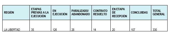 De dicha cifra, 330 se encuentran en estado de Obra/Servicio (en ejecución o concluidas): 126 obras y servicios en ejecución; 28 paralizadas y abandonadas; 20 en etapa de recepción y 14 con contratos resueltos (cancelados).