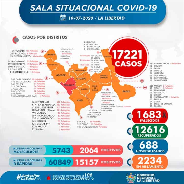 La Gerencia Regional de Salud de La Libertad, en su reporte al 10 de julio, informó que se han procesado 66592 (+ 1142) pruebas entre rápidas y moleculares, resultando 17221 (+ 688) casos positivos por Coronavirus en La Libertad, en las últimas 24 horas procesaron 1142 pruebas, resultando 688 nuevos infectados por Covid-19.