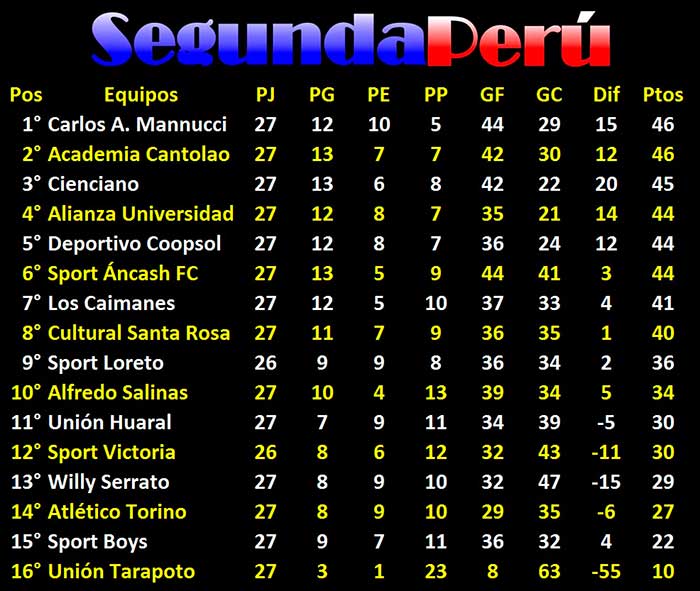Luego de jugarse la fecha 27, la tabla de posiciones marcha es: Carlos A. Mannucci y Academia Cantolao comparten la punta con 46 puntos; seguido por Cienciano con 45; Coopsol, Sport Áncash y Alianza Universidad con 44 unidades.