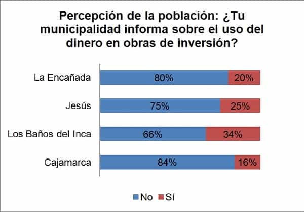 Más del 84% de la población de Cajamarca considera que su municipalidad no informa sobre el uso del dinero en obras de inversión, mientras que un 16% afirma lo contrario. Asimismo, el 80% de la población de La Encañada considera que no se informa, mientras que un 20% afirma lo opuesto.