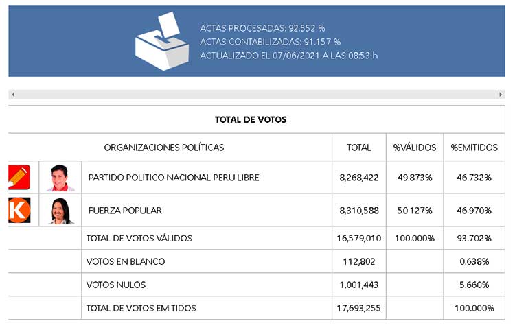La candidata de Fuerza Popular, Keiko Fujimori, obtiene el 50.127 % de la votación nacional, seguida de Pedro Castillo, de Perú Libre, con 49.873 %, al 92.552 % de las actas procesadas por la Oficina Nacional de Procesos Electorales (ONPE).