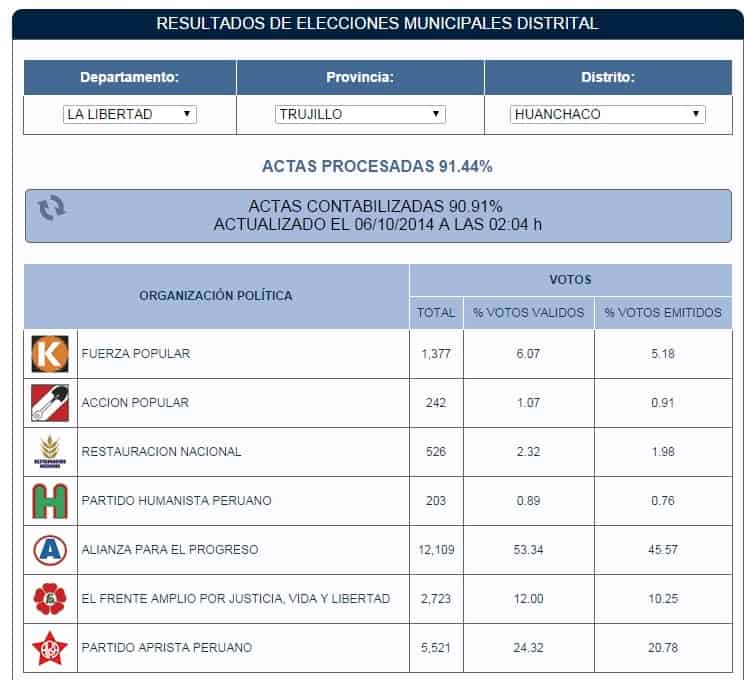Resultados según la ONPE al 91,44 % en el distrito de Huanchaco