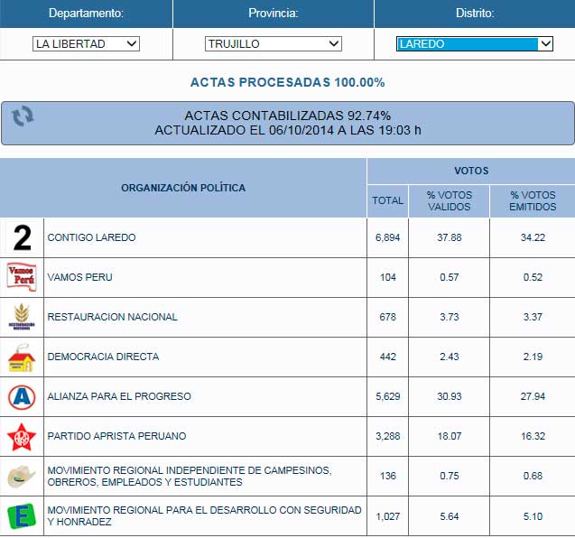 Resultados según la ONPE al 100 % en el distrito de Laredo