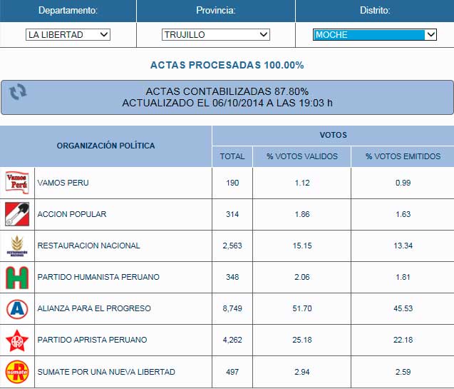 Resultados según la ONPE al 100 % en el distrito de Moche
