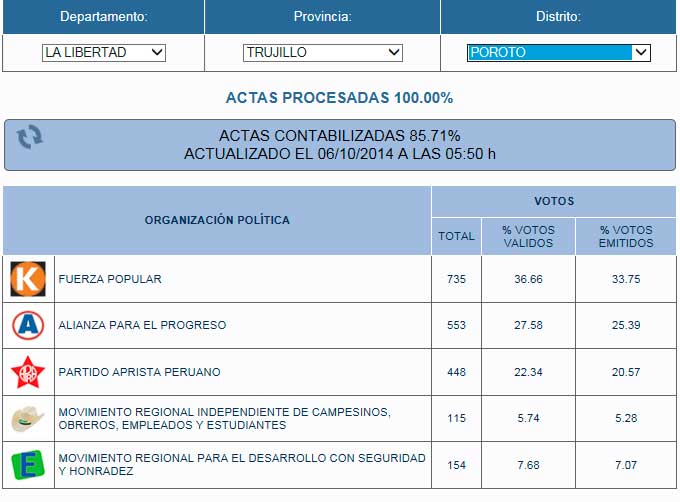 Resultados según la ONPE al 100 % en el distrito de Poroto