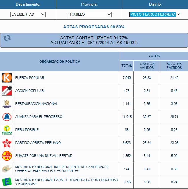 Resultados según la ONPE al 99.59 % en el distrito de Víctor Larco