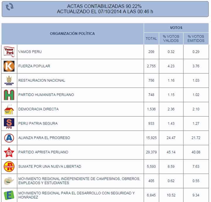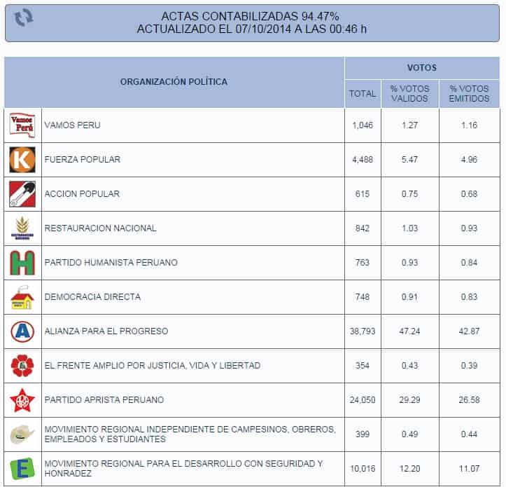 Resultados según la ONPE al 96.09 % en el distrito de El Porvenir