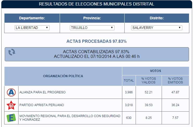 Resultados según la ONPE al 97.83 % en el distrito de Salaverry