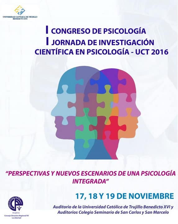 La Facultad de Ciencias de la Salud de la Universidad Católica de Trujillo Benedicto XVI, ha organizado el Primer Congreso y Jornada de Investigación Científica de Psicología para el 17, 18 y 19 de noviembre, en el auditorio principal de la UCT y del Colegio Seminario San Carlos y San Marcelo (Cuadra 2 del Jr. Gamarra).