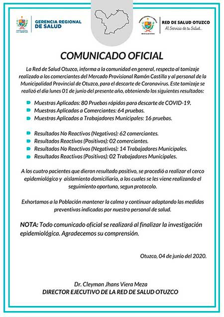 La Red de Salud Otuzco, informó que ha realizado 64 pruebas rápidas a los comerciantes del Mercado Provisional Ramón Castilla, resultando 2 casos positivos de coronavirus.