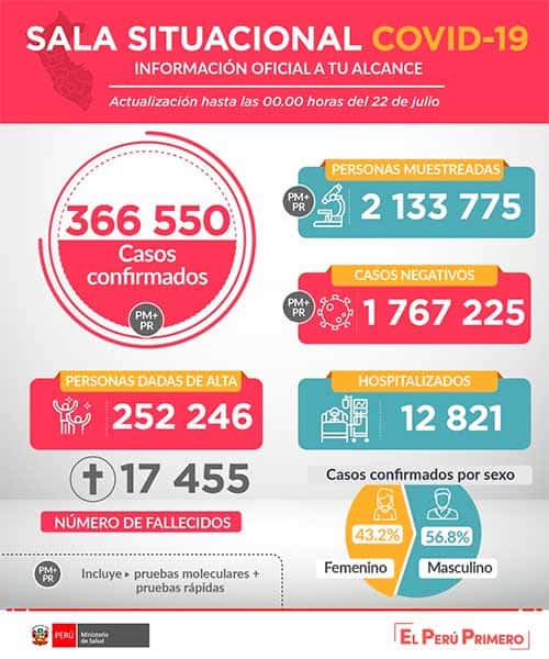 El Ministerio de Salud (Minsa) informa que al 22 de julio de 2020 se han procesado muestras para 2’133,775 personas por Covid-19, obteniéndose, hasta las 00:00h, 366,550 resultados positivos y 1’767,225 negativos.