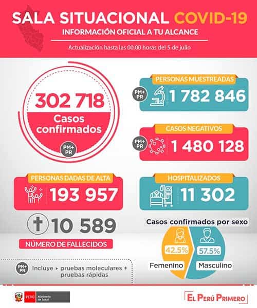 El Ministerio de Salud (Minsa) informa al 5 de julio de 2020 se han procesado muestras para 1’782,846 personas por Covid-19, obteniéndose, hasta las 00:00h, 302,718 resultados positivos y 1’480,128 negativos.