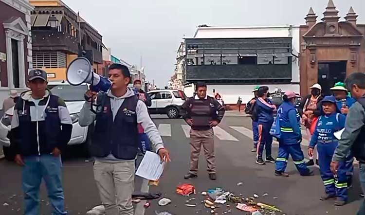 Los trabajadores del Servicio de Gestión Ambiental de Trujillo (Segat) llegaron hasta el frontis de la Municipalidad Provincial de Trujillo para exigir el pago de su sueldos y bonificaciones. Además, como protesta arrojaron basura para ser escuchados.
