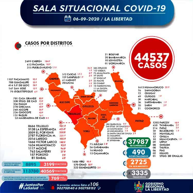 La Gerencia Regional de Salud de La Libertad, informa que al 06 de setiembre, se han procesado 122 675 (+ 444) pruebas entre rápidas y moleculares, resultando 44 537 (+ 313 ) casos positivos por Coronavirus en La Libertad, en las últimas 24 horas procesaron 444 pruebas, resultando 313 nuevos infectados por Covid-19,