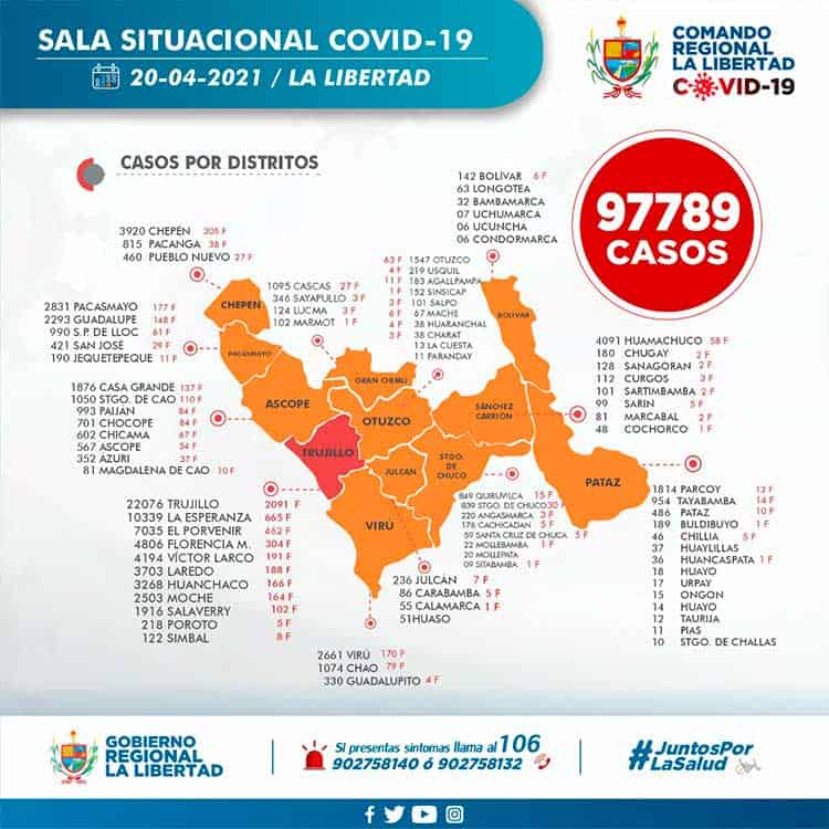 La Gerencia Regional de Salud de La Libertad , informa que al 20 de abril, se han procesado 274 308 (+ 818) pruebas entre rápidas y moleculares, resultando 97 789 (+ 314) casos positivos por Coronavirus en La Libertad , en las últimas 24 horas procesaron 818 pruebas , resultando 314 nuevos infectados por Covid-19.