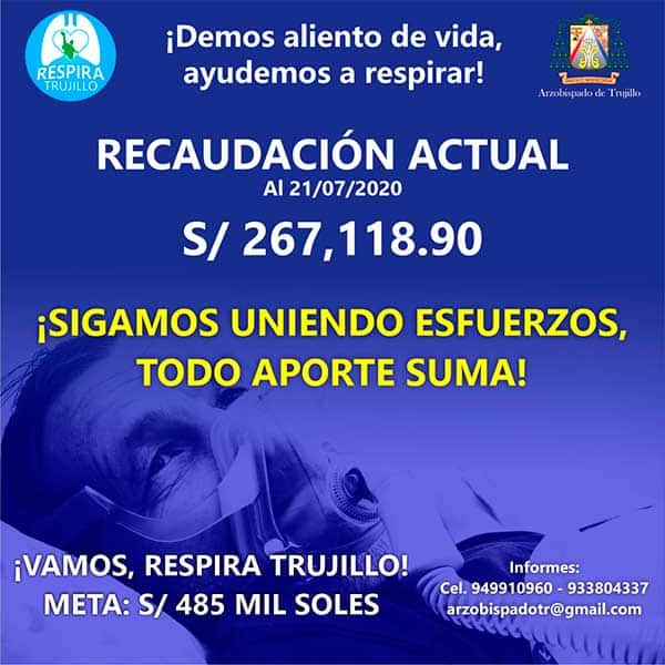 Con la fuerza solidaria de los trujillanos, la campaña “Respira Trujillo”, emprendida por esta Arquidiócesis, superó la mitad de la meta: 267 mil 118.90 soles, fondo que servirá para iniciar los primeros trámites administrativos que demandan la compra extranjera de la planta de oxígeno medicinal.