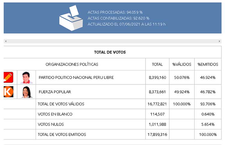 El candidato de Perú Libre, Pedro Castillo, obtiene el 50.076% de la votación nacional, seguido por Keiko Fujimori de Fuerza Popular, con 49.924%, al 94.059% de las actas procesadas y 92.620 % de actas contabilizadas por la Oficina Nacional de Procesos Electorales (ONPE).