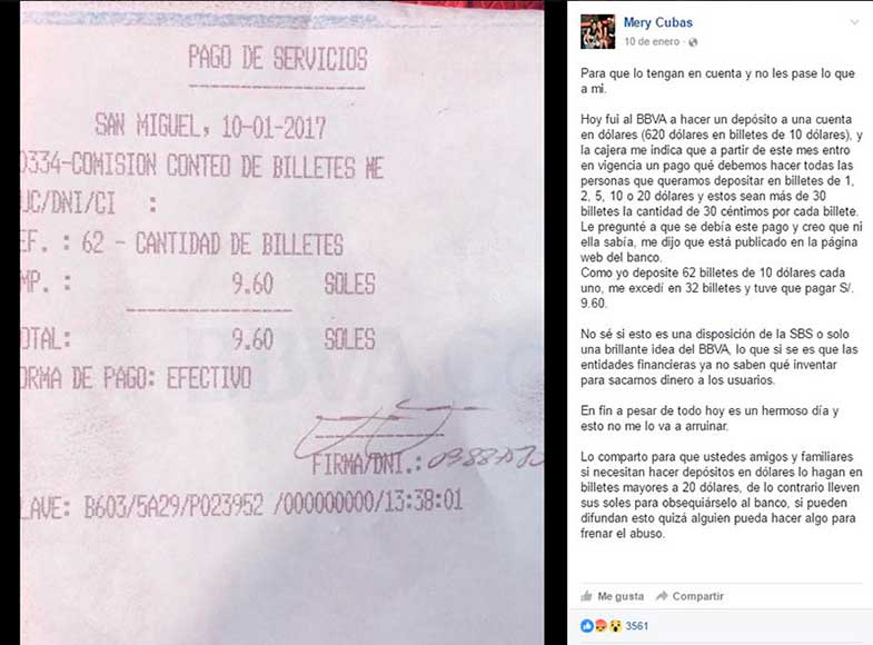 El 10 de enero, una usuaria publicó en Facebook que el banco BBVA Continental le cobró una comisión por conteo de billetes al hacer un depósito de US$620 en billetes de US$10, operación por la cual tuvo que pagar S/9,60.