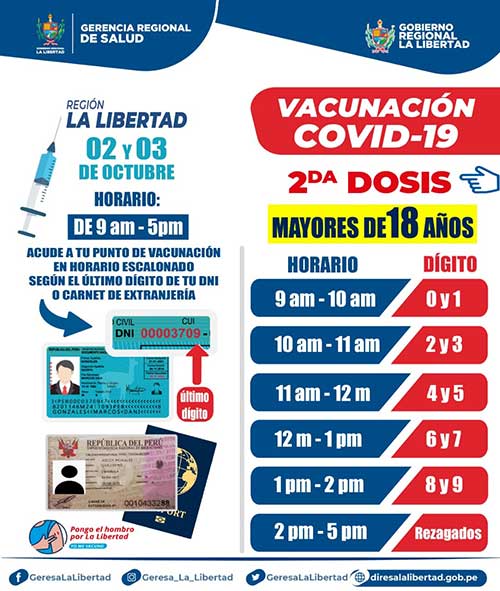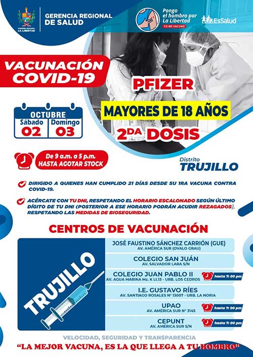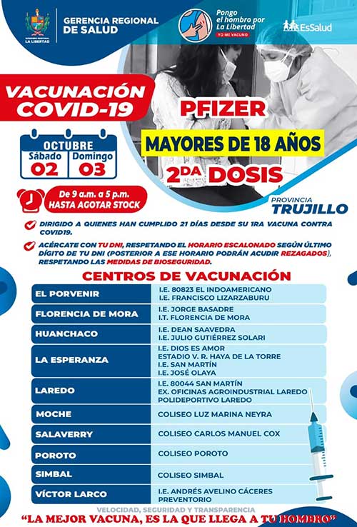 Se reanuda vacunación en La Libertad en su 2da dosis de PFIZER, para mayores de 18 años o quienes cumplan esta edad hasta el 31 de diciembre del 2021.