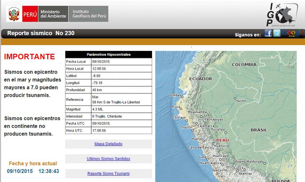 Sismo: Fecha y Hora Local:09/10/2015,12:08:56; Fecha y Hora UTC:09/10/2015,17:08:56; MAG:4.3 ML; PROF:45 km; INT:II Trujillo, Chimbote; REF:58 Km S de Trujillo-La Libertad