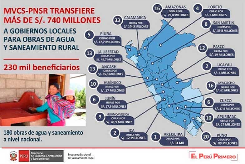 Más de 230,000 peruanos de localidades rurales en 18 regiones del país serán beneficiados este año con obras de agua potable y saneamiento, que demandarán una inversión de S/ 742,206,925 millones que el Ministerio de Vivienda, Construcción y Saneamiento (MVCS) ha transferido, a través del Programa Nacional de Saneamiento Rural (PNSR), a los gobiernos locales.