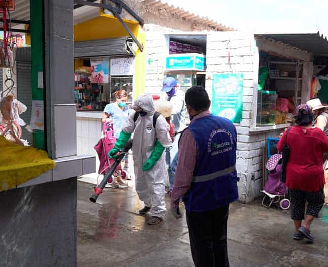 En coordinación con la alcaldía provincial, se realizó una campaña de desinfección de los exteriores de los mercados: “Wilfredo Carranza” de la Urb. Santa Isabel, José Faustino Sánchez Carrión, Las Capullanas, Jesús de Nazareth y Nor Aves.